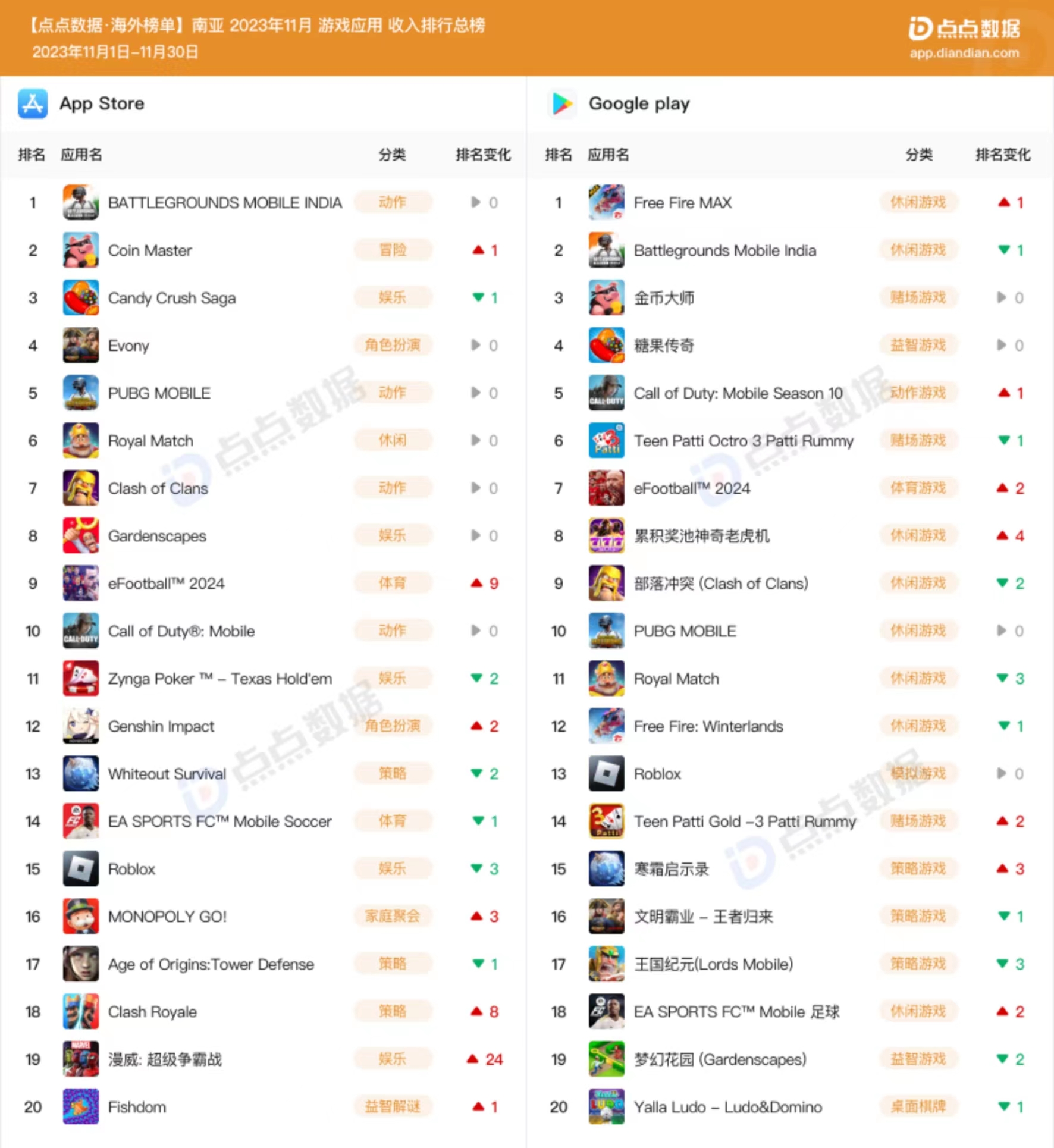 11 月南亚手游收入榜中,Garena 旗下大逃杀射击游戏《Free Fire MAX》收入再次暴增并力压绝地求生印度版本手游《BATTLEGROUNDS MOBILE INDIA》成为手游收入冠军。11 月该游戏预估收入超过 203 万美元,仅 Google Play 单平台收入便超越后者收入总和。而《BATTLEGROUNDS MOBILE INDIA》依旧是南亚地区 App Store 收入榜冠军。