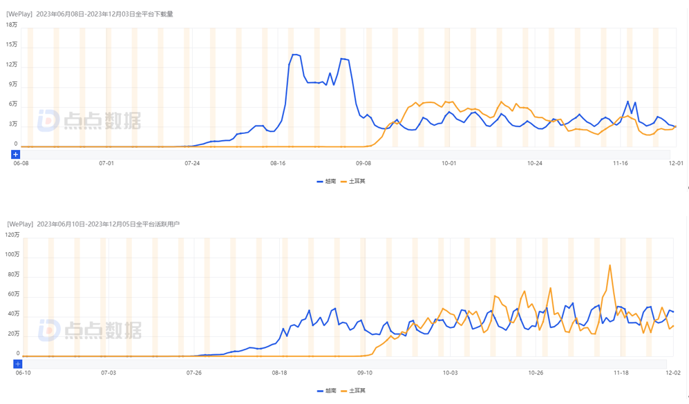 WePlay 越南、土耳其市场近一年双端下载量和 DAU|图片来源:点点数据