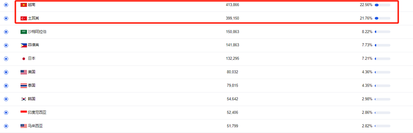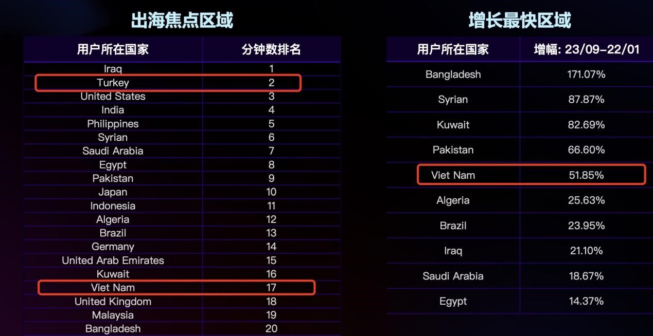 根据笔者参与的声网泛娱乐产品会议中看到的数据,2023 中东和东南亚的一些非头部出海市场的音视频使用分钟数增长非常明显,可以看到越南市场现在已经在全球排名第 17 了,而且 2023 年有 51% 的增长,土耳其则排在全球第二。