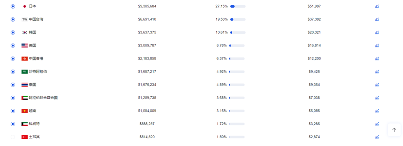 越南和土耳其市场近 30 天的收入分别为 35W+和30W+美金,只低于日、韩、中国台湾、美国市场,属于第二梯队,与泰国、中国香港水平相当。而且和其他收入较高的市场相比,越南、土耳其市场用户的消费行为是有一些不同的。