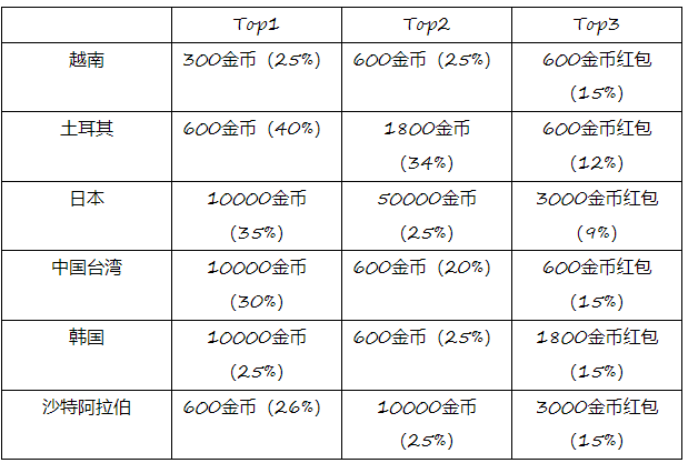 部分市场 iOS 端的内购销售额 Top3 及占比,注:300 金币的价格约为 0.5 美金,10000 金币的价格为 13 美金|数据来源:点点数据
