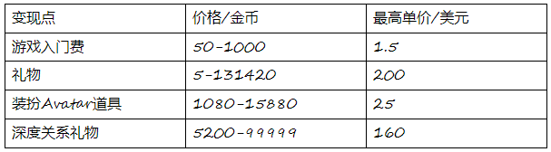 WePlay 的主要变现点和参考价格,注:600 金币大约相当于1美元|信息来源:网络
