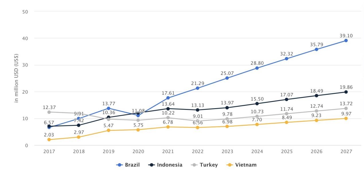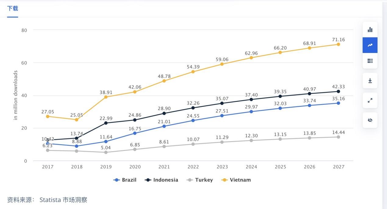 2017-2027 巴西、印尼、土耳其、越南市场社交博弈游戏下载量数据,单位:百万次下载|图片来源:statista