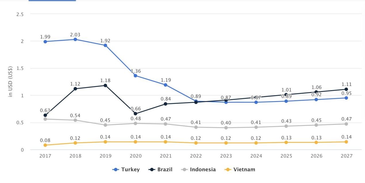 2017-2027 越南、土耳其、巴西、印尼市场社交博弈游戏总营收(百万美元)和 RPD(美元)|数据来源:statista