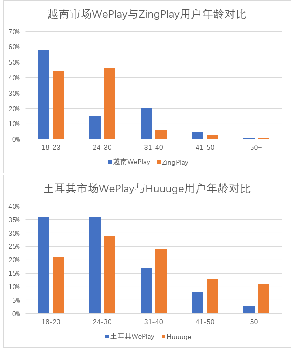 越南与土耳其市场 WePlay 与社交博弈游戏代表 App 用户年龄对比,注:对比产品为各市场 Google Play 博弈游戏畅销榜第一|数据来源:点点数据