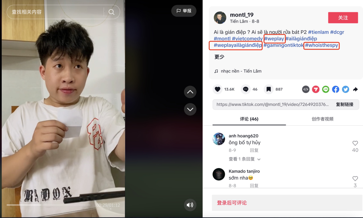WePlay 在 TikTok 平台上的 KOL 内容(越南)|图片来源:TikTok