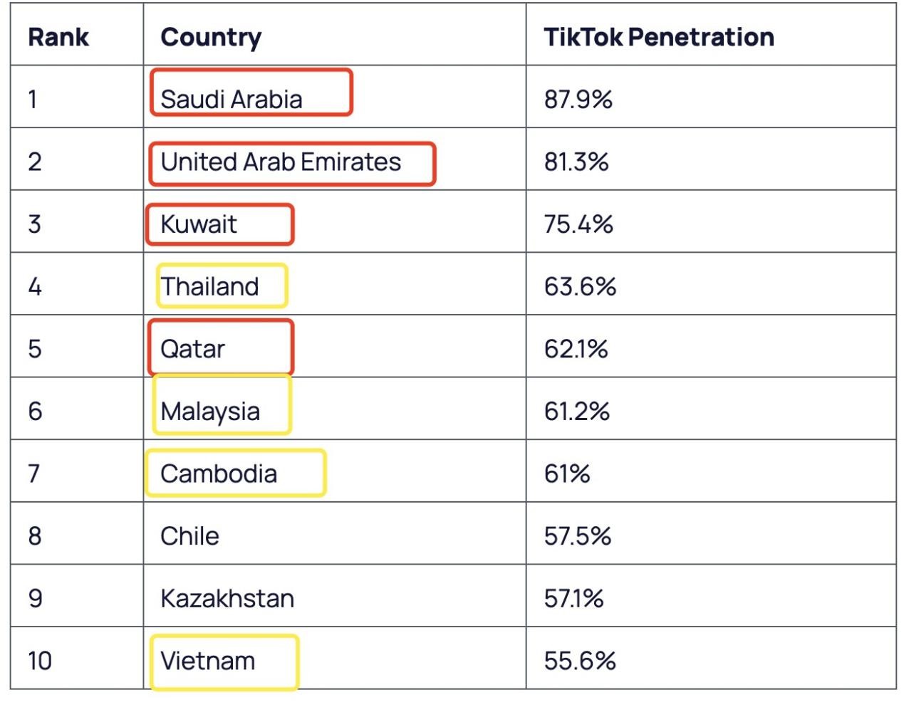TikTok 用户渗透率排名前 10 的市场,注:红框中国家属于中东地区,黄框中国家属于东南亚地区|图片来源:explodingtopics