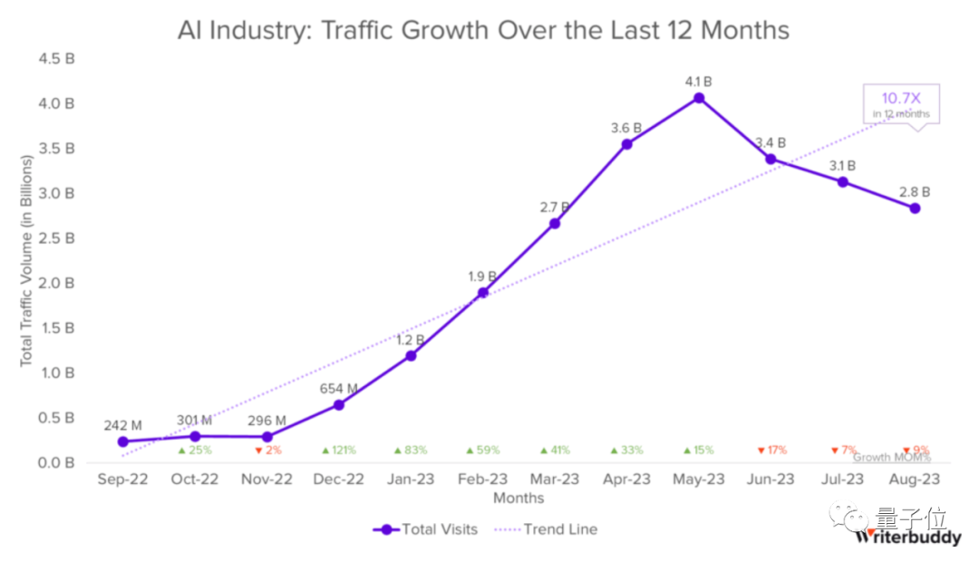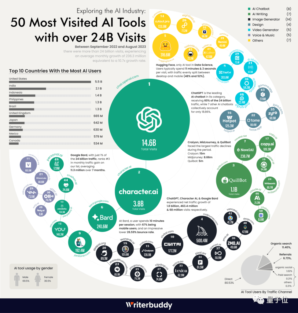 机构 Writerbuddy 研究了 3000 多个 AI 的数据,最终分析出如上结果。