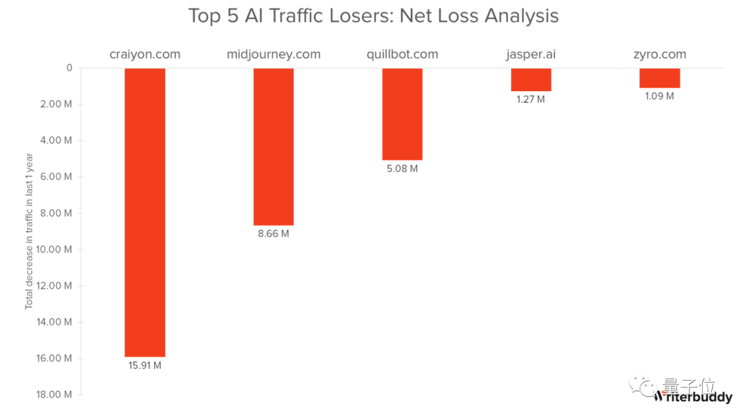 流量流失的前五名,则分别是 Craiyon、Midjourney、Quillbot、Jasper、Zyro。