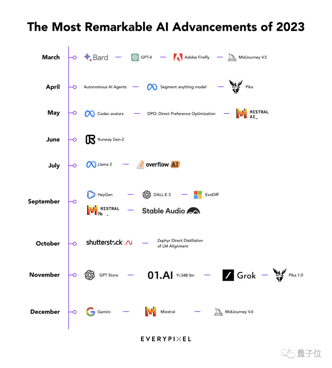 来自 Everypixel Journal 的一份统计报告,梳理了 2023 年 3 月-12 月 AI 行业值得关注的大事件。