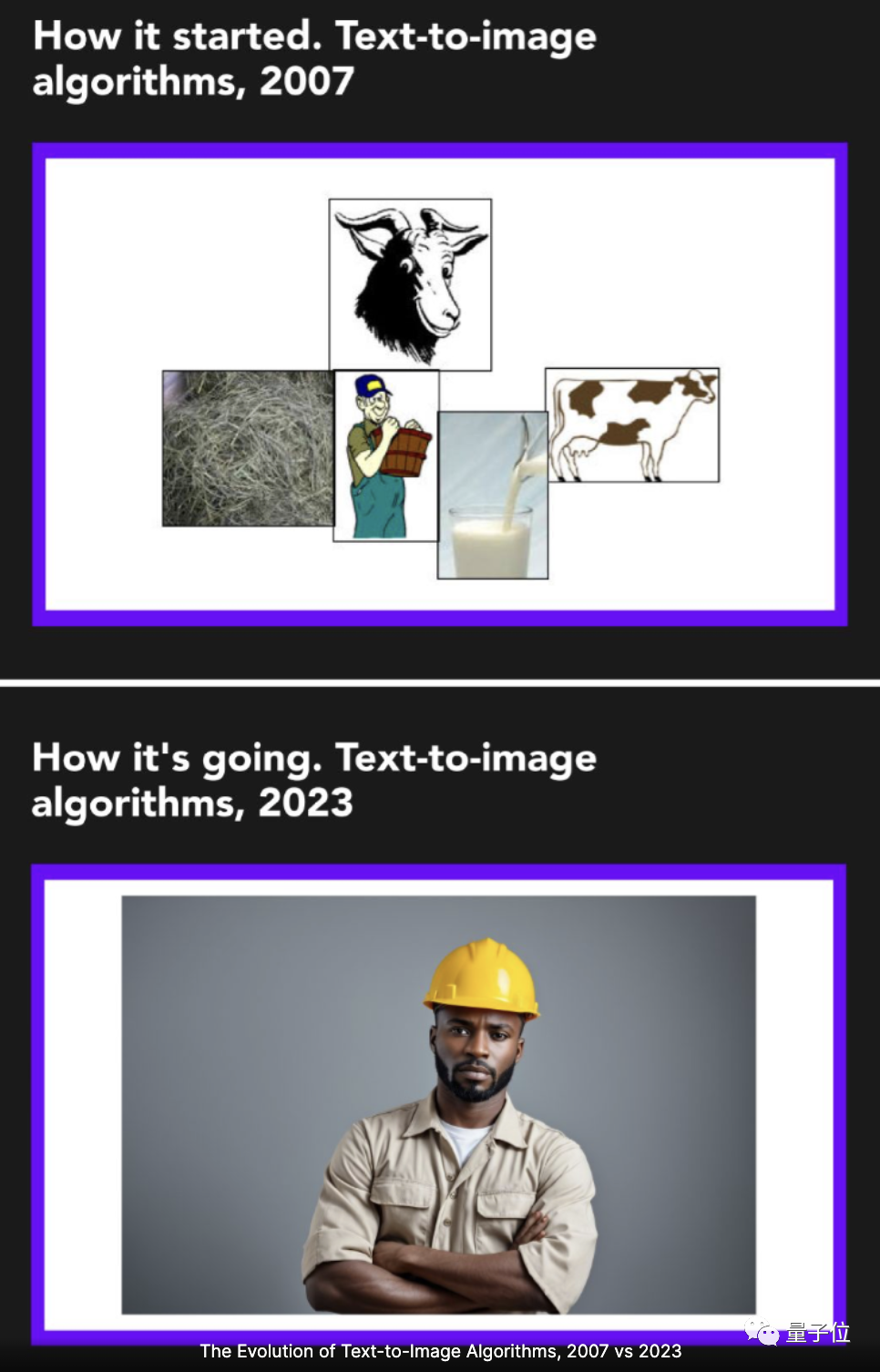 图片生成领域也已今时不同往日,下面是 2007 年文本-图像生成和 2023 年的效果对比: