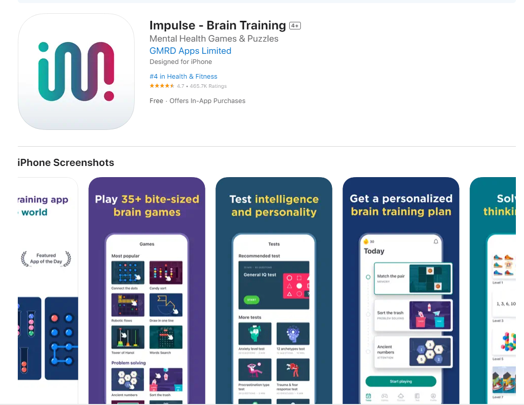 根据App Store中官方的应用介绍,“您可能知道,尽管衰老,您的大脑仍然能够成长、学习事物并形成新的神经连接。这个过程称为大脑可塑性,需要定期训练。《Impulse》应用程序为您提供了一种通过玩有趣且具有挑战性的智力游戏来改善心理健康的好方法。”