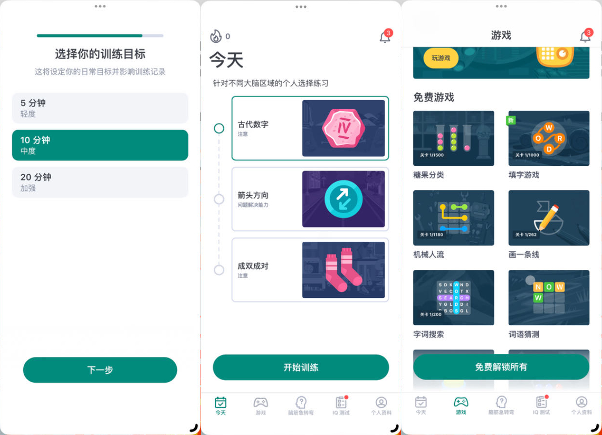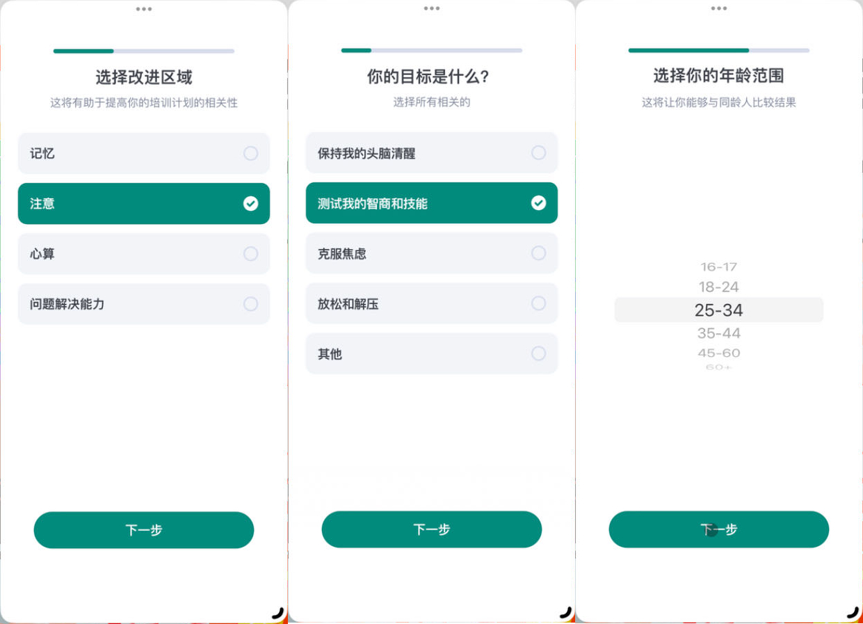具体到功能上,当玩家进入应用后,系统会提出几个有关个人隐私的问题,比如年龄、用户所需要改善的问题(目标)、每天愿意花费在”锻炼“大脑上的时长等,为用户生成一个特定的、由数个小游戏组成的训练计划。