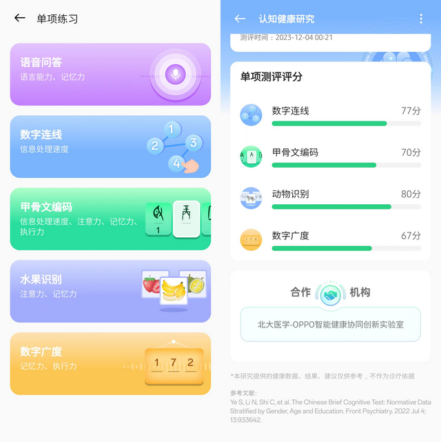 一方面,国内确实也有专业机构在做类似的研究。就比如笔者自己锻炼时使用的智能手表的配套应用里,就有北大医学院联合该手表品牌健康研究项目,同样也都是通过一系列的小游戏,来测试、训练认知健康。这证明用游戏来锻炼认知确实有一定的学术基础。