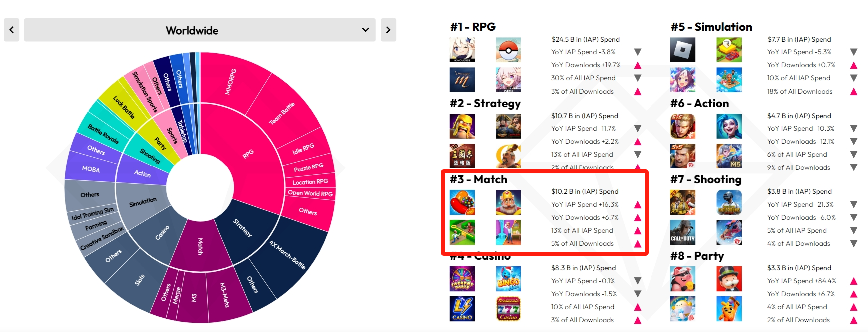 消除和派对类游戏是唯二在 2023 年下载量和流水都实现增长的头部品类(红框圈出) | 图片来源:data.ai