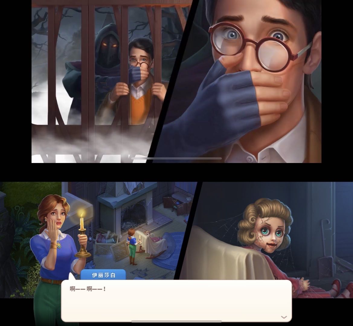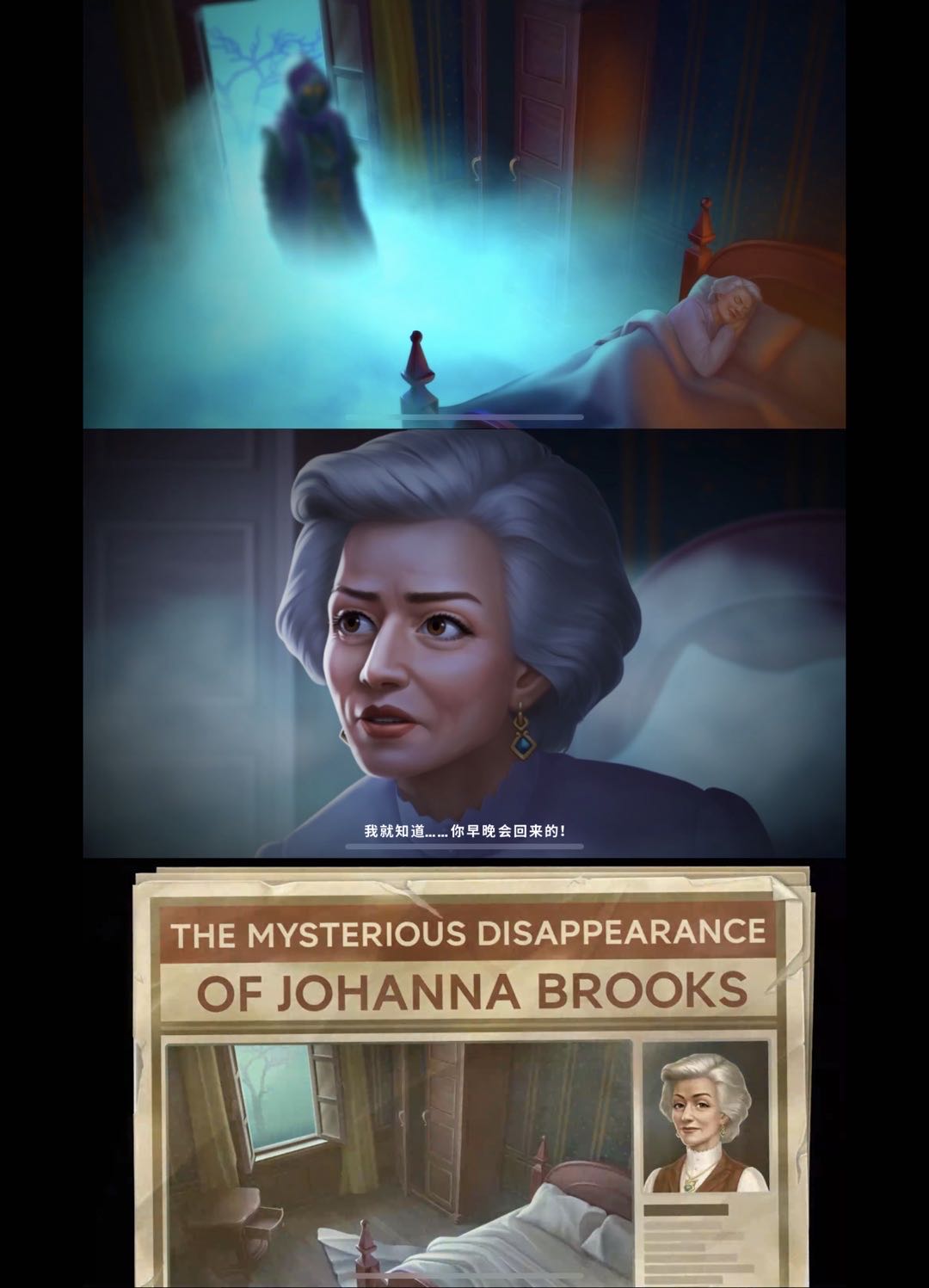 游戏开场首先播了一段动画。一个身披斗篷的黑影就出现在了一幢别墅的卧室内,劫持走了一位老太太。被劫走之前,这位老太太还表示自己对黑影的到来早有预感。昏暗的午夜配合有点渗人的音效,比「Homescapes」里那位颇为喜感的“地中海”男主角回老家的剧情要刺激很多,也给习惯了各种合家欢以及抓马剧情的三消玩家们带来一点小小的震撼。