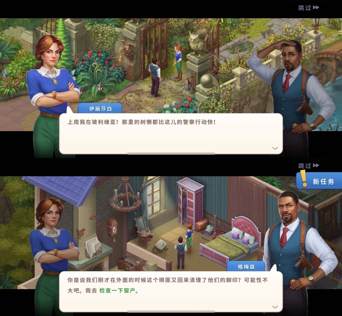第二章开篇,伊丽莎白会请来一名警官帮忙,故事的背景也从夜晚变成了白天。两人一边相互吐槽拌嘴,一边收集证据断案,恋情线呼之欲出。这又回到了三消+剧情手游里相当常见的恋爱抓马上。“底色”依然是一样,只不过换了惊悚作为“调料”。