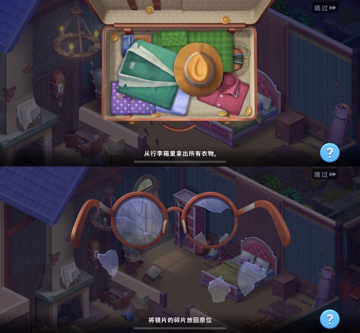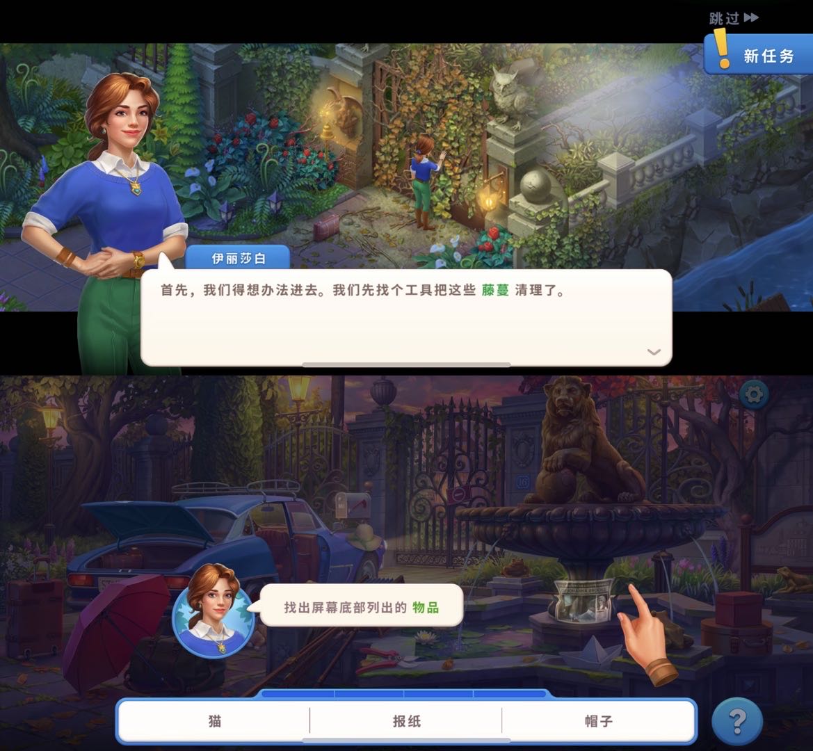 不过虽然剧情上讲有些吓人,但「Mystery Matters」的美术设定依然是 Playrix 常见的卡通风格,并不会特别突出恐怖画风,因此不至于让人不敢玩下去。Playrix 只想把“惊悚”打造成一个强化游戏吸引力的卖点,调剂一下被各种抓马爱情占据的市场,本身并不主打恐怖体验。因为,从第二章开始,一切又有一点熟悉的味道。