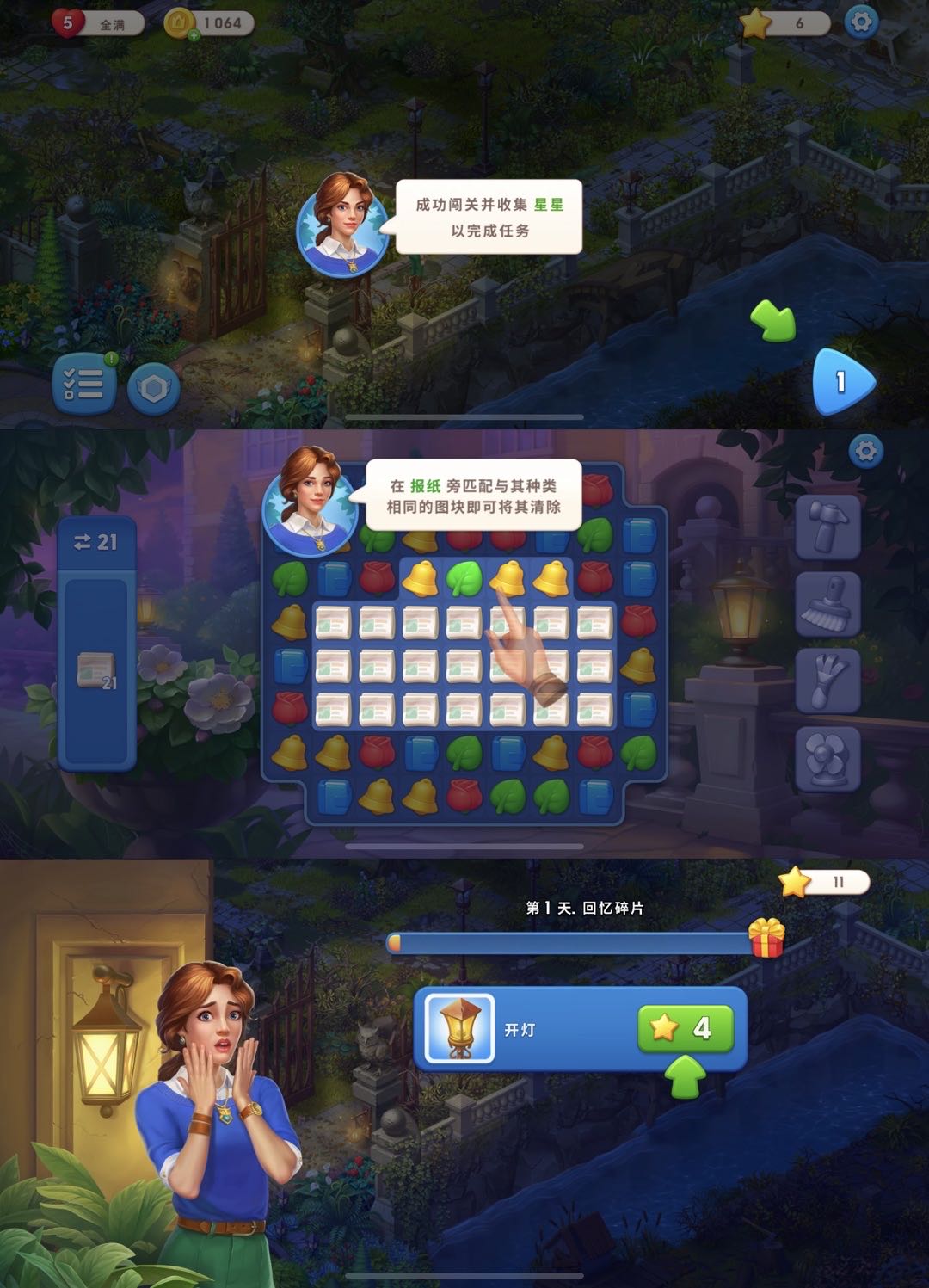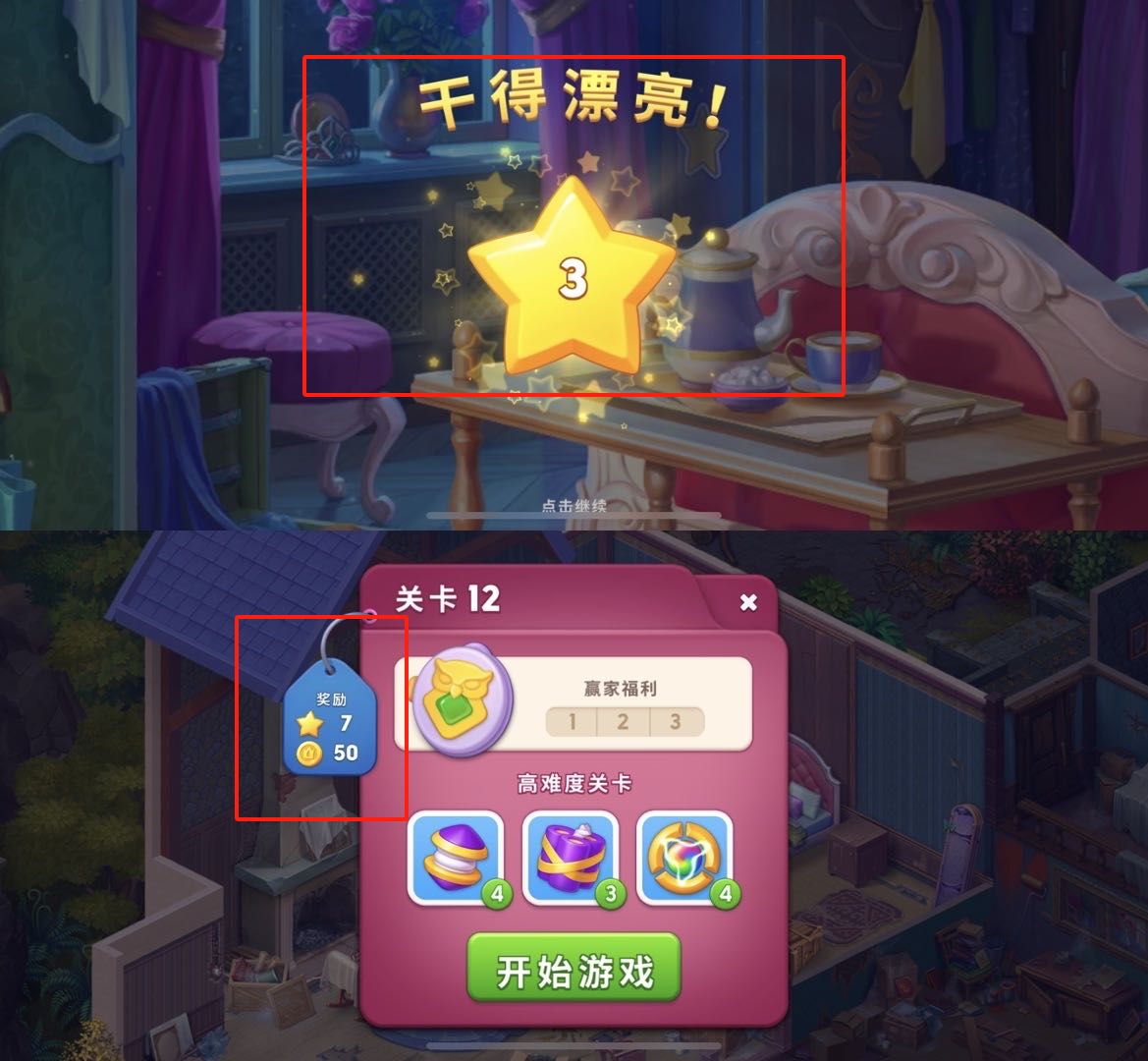 虽然都能获得星星,但三消部分的奖励明显比寻物解谜要多 | 图片来源:Mystery Matters