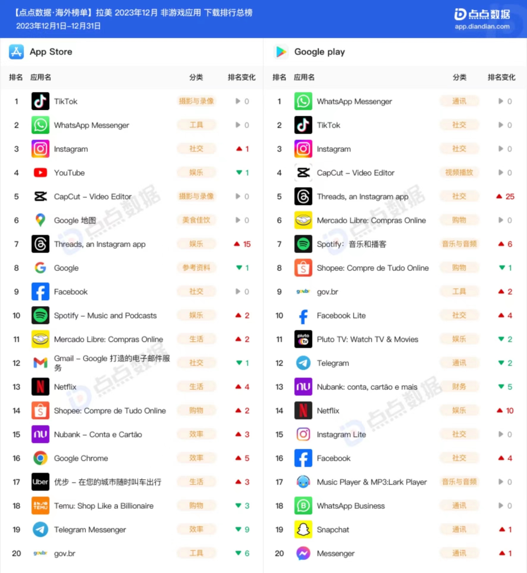 在近几个月马斯克及旗下文字社交应用 X(原 Twitter)话题不断的同时,其对标应用 Meta 旗下 Threads 则是继 9 月份下载量持续下降以来在 11 月底重回升势,而根据应用情报公司的消息其原因是其母公司 Meta 开始为 Threads 投放广告。12 月 Threads 在拉美地区下载量增幅明显,其排名也重返榜单并进入前十。