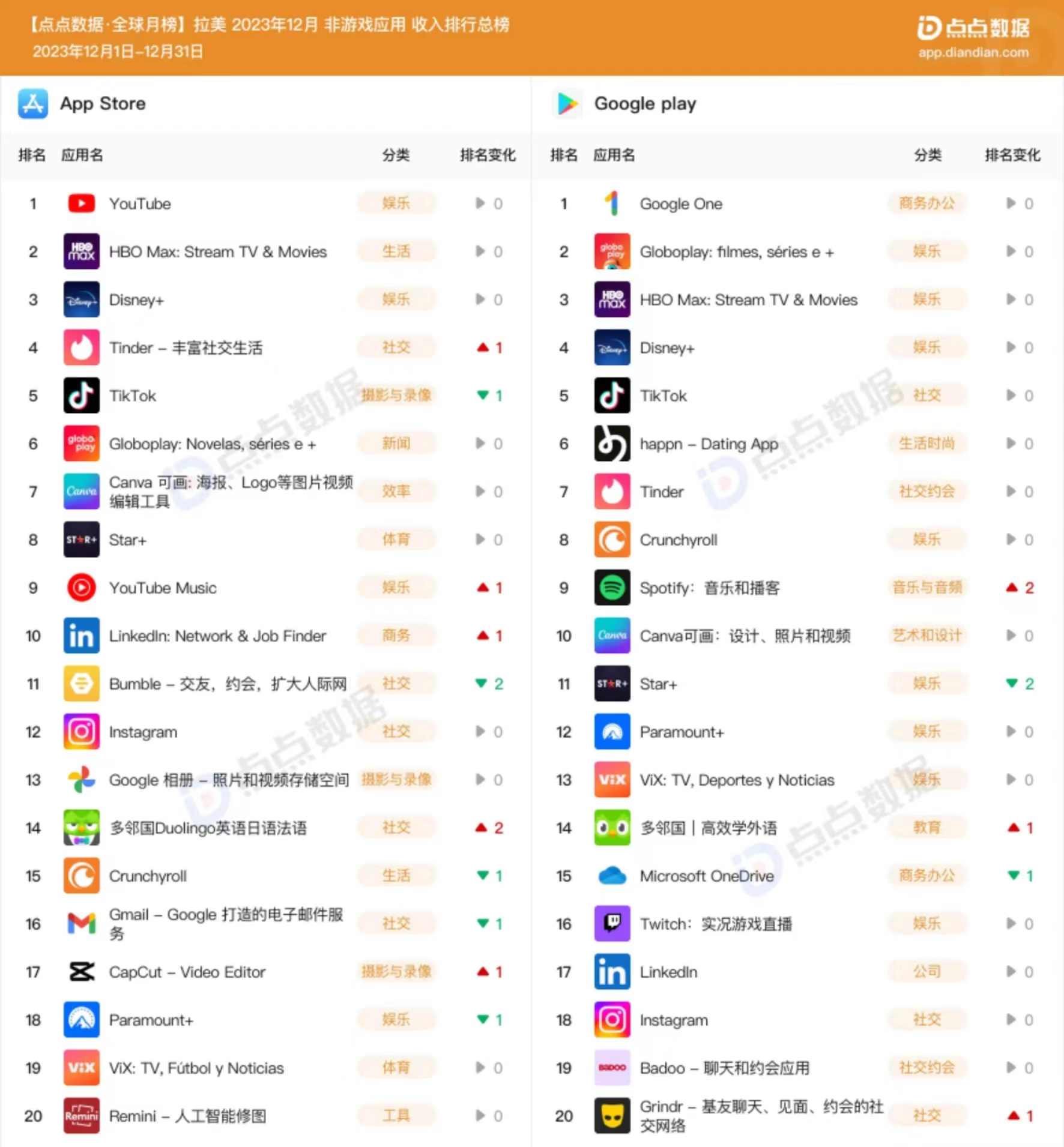或是受到游戏业务的加持,连发数款爆品的奈飞旗下流媒体应用 Netflix 订阅量也是出现了较为明显的上浮,其 12 月在拉美地区双平台非游应用下载榜的排名都有不同程度的上升。
