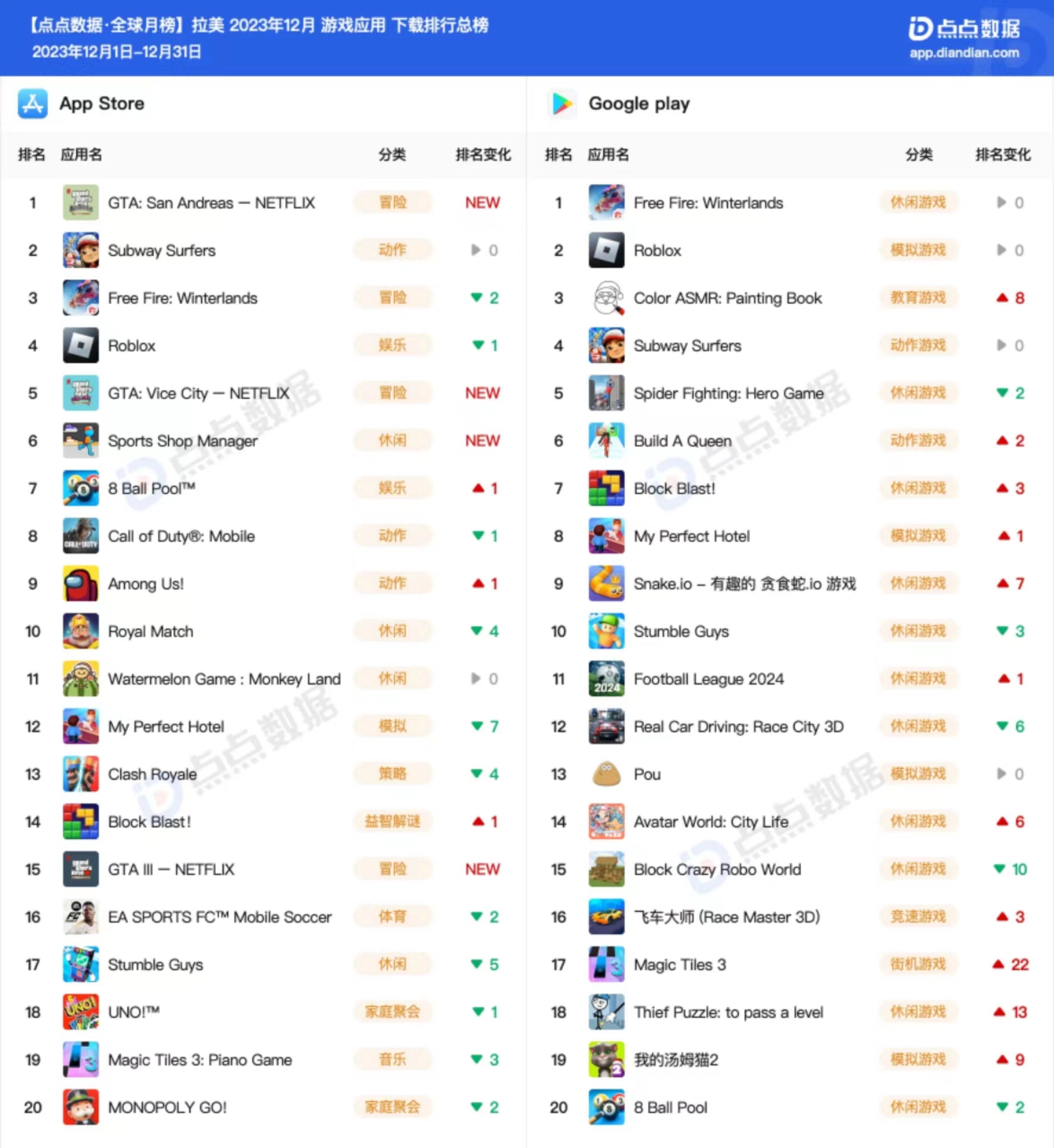 12 月拉美地区手游下载冠军再次由 Garena 旗下的大逃杀射击游戏《Free Fire》摘得,其上月继续把持 Google Play 手游下载榜榜首,12 月该游戏在拉美地区双平台下载总量超过 595 万,环比增幅超过 16.6%。而 App Store 手游下载榜冠军则由 Netflix 上月推出的“GTA 三部曲”最终版之一的《GTA: San Andreas》摘得。