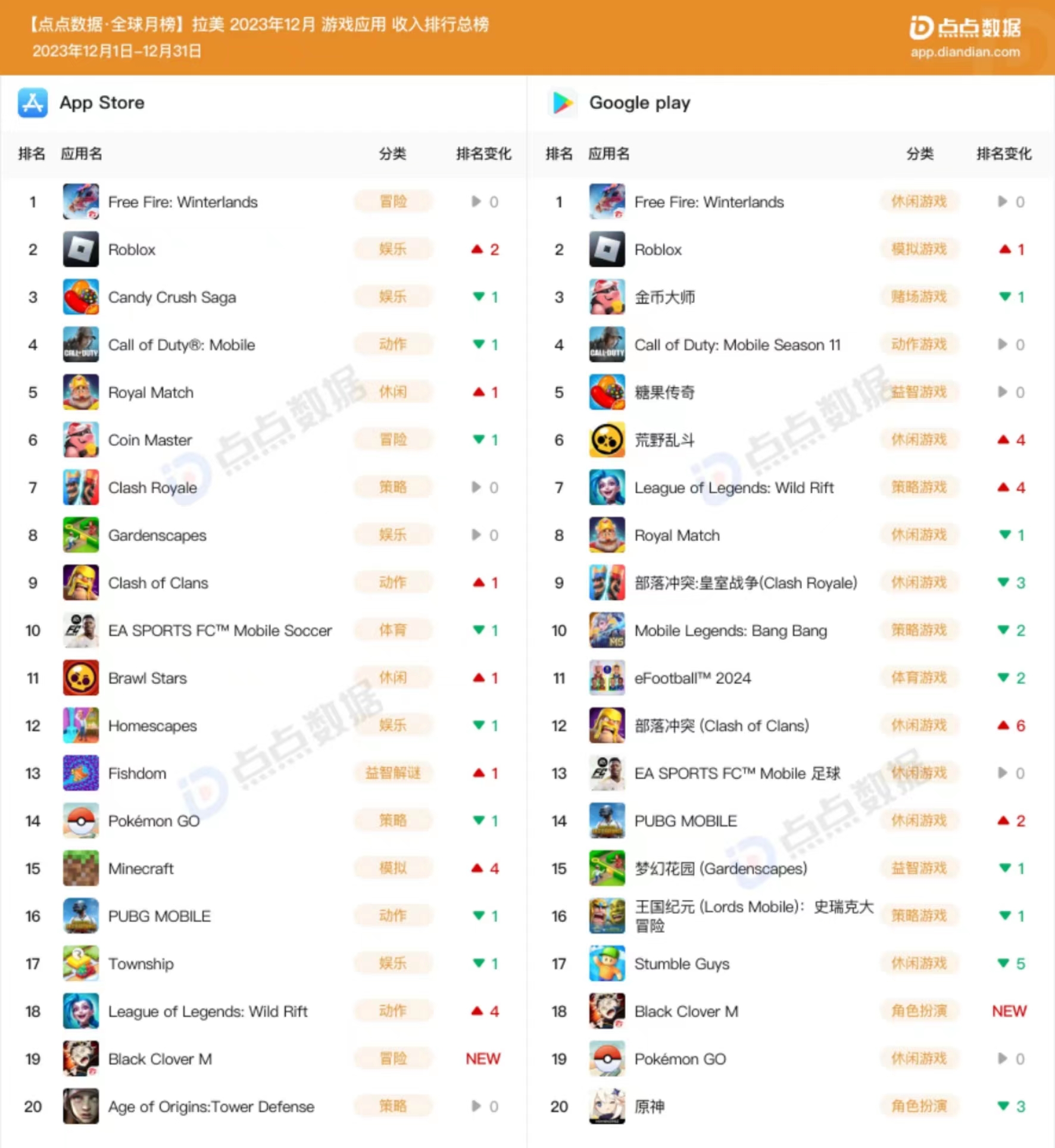 统计周期内,Garena 旗下《Free Fire》再次依靠新赛季活动成为 12 月拉美地区手游收入冠军,以及双平台手游收入榜榜首应用,其 12 月预估总收入超过 723 万美元,收入数据环比上浮超过 18.1%。上月元宇宙游戏平台《Roblox》预估收入反超《Coin Master》(金币大师)成为收入第二高的手游。