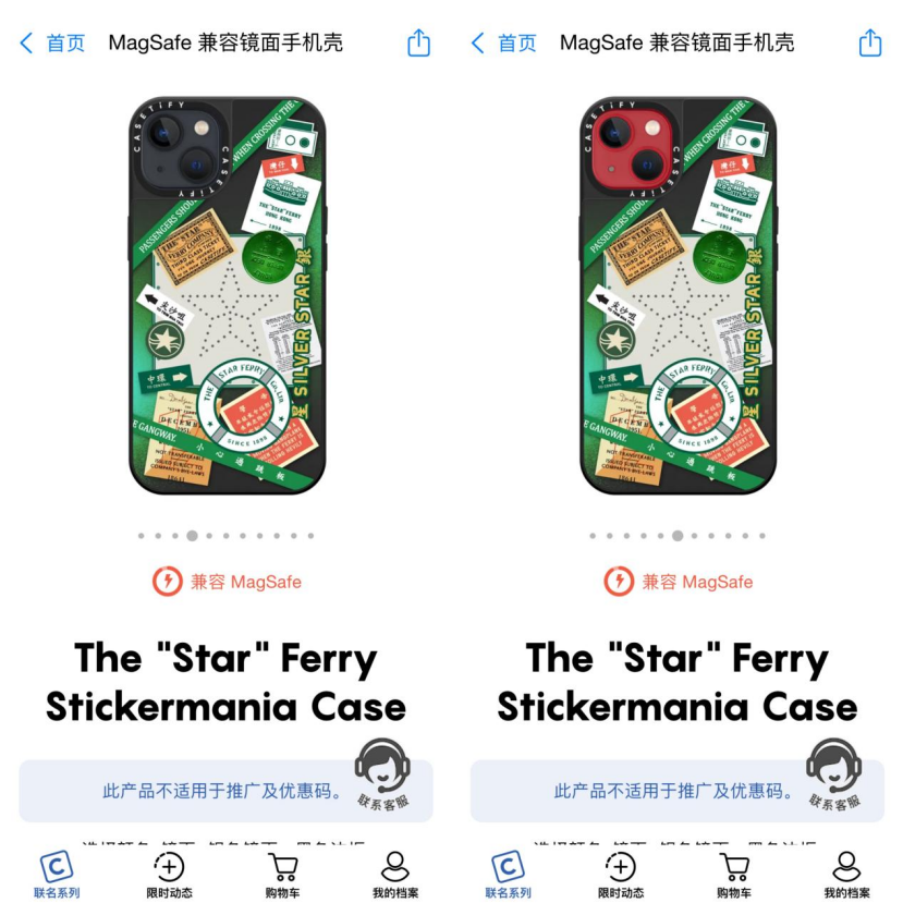 CASETiFY的产品详情页中,用户选择某一手机型号,图片会展示手机壳在该型号每一个颜色手机上的样子。多数手机壳品牌只会做黑白色手机的套壳图,导致买小众颜色的用户买回家套上时才发现并不适合。这种细节服务会让用户的购买体验更好一些。