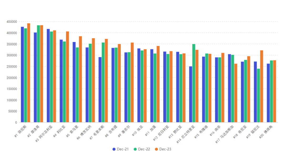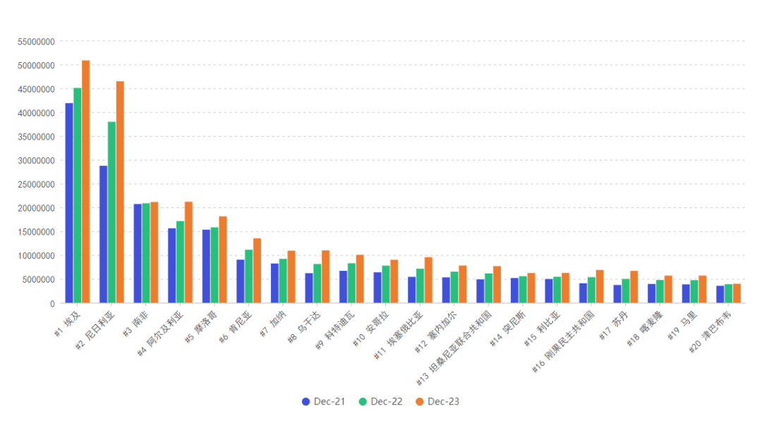 图:非洲活跃人数 TOP20 国家市场,2021-2023 年 12 月活跃用户数量变化,来源:DataSparkle-AppSparkle-市场分析