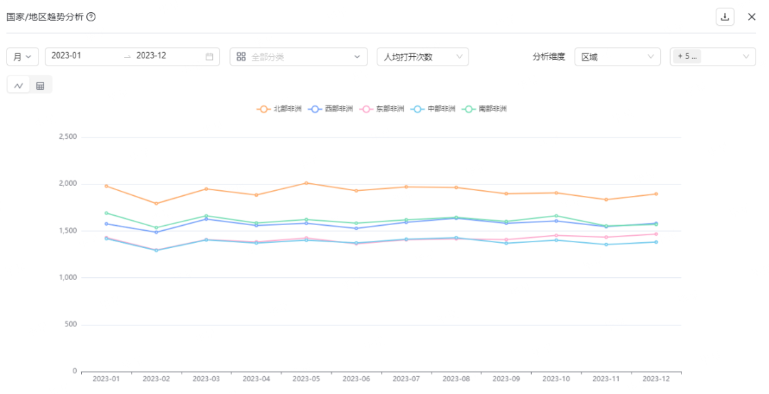 图:2023 年非洲各区域月人均打开次数变化,来源:DataSparkle-AppSparkle-市场分析