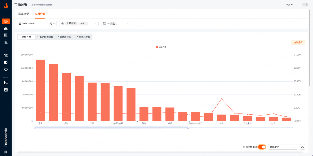 图:2024 年 1 月 15 日至 21 日非洲活跃人数 Top20 应用品类活跃人数及人均使用时长环比变化,来源:DataSparkle--AppSparkle