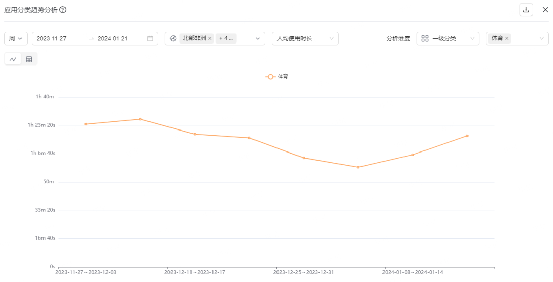 其中,统计周期内体育类应用人均打开时长环比上周增长了 16.88%,人均打开次数环比上涨 16.19%。得益于移动互联网和高速网络的快速发展,越来越多的非洲人能够便捷地获取各种体育信息资源,这也是他们热衷于使用体育应用的原因之一。