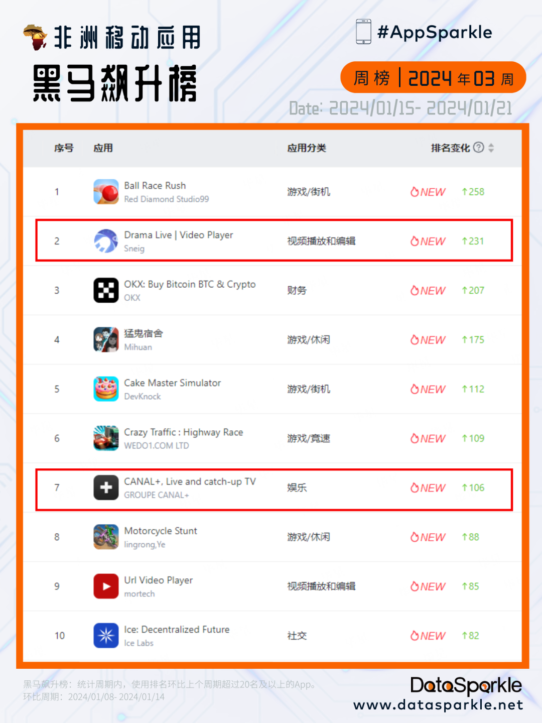 图:2024.1.15-2024.1.21 日非洲移动应用市场黑马飙升榜,来源:DataSparkle--AppSparkle