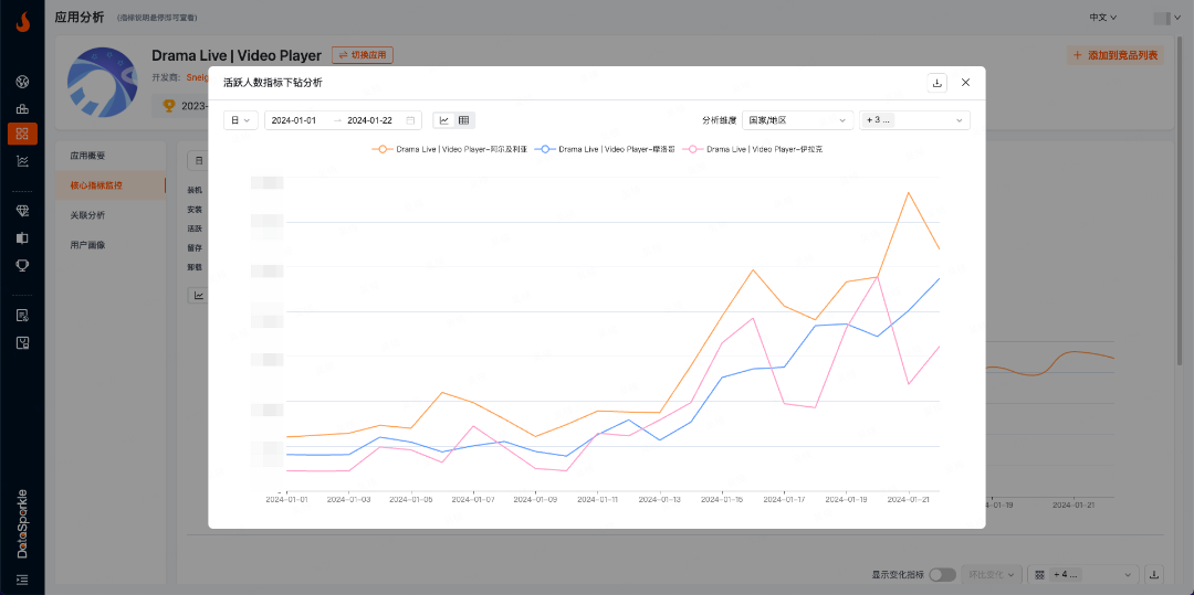 图:《Drama Live | Video Player》Top3 国家市场活跃人数变化,来源:DataSparkle--AppSparkle