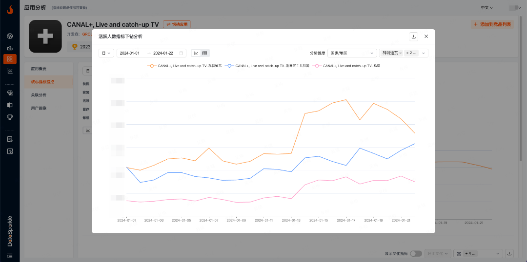 图:《CANAL+, Live and catch-up TV》Top3 国家市场活跃人数变化,来源:DataSparkle--AppSparkle