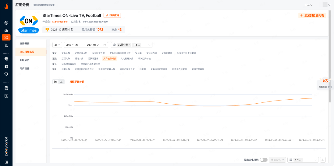 图:《StarTimes ON-Live TV, Football》人均使用时长变化,来源:DataSparkle--AppSparkle