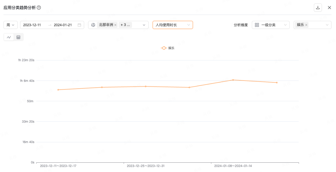 图:非洲视频播放与编辑和娱乐类应用人均使用时长变化,来源:DataSparkle--AppSparkle--趋势分析