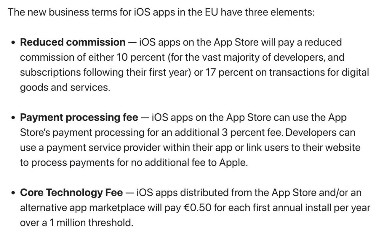 之前在某些市场,如美国和韩国,苹果已经放开了三方支付或者支付外跳链接,通过 App Store 分发App的开发者已经可以使用第三方支付服务或通过链接引导用户跳转到网站上进行支付,但苹果仍会收取抽成,抽成比例从之前的 30%(小企业 15%)降至 27%(小企业 12%),让利 3 个点....加上三方服务可能收取的费用、或者一些摩擦成本,开发者并未受益多少。