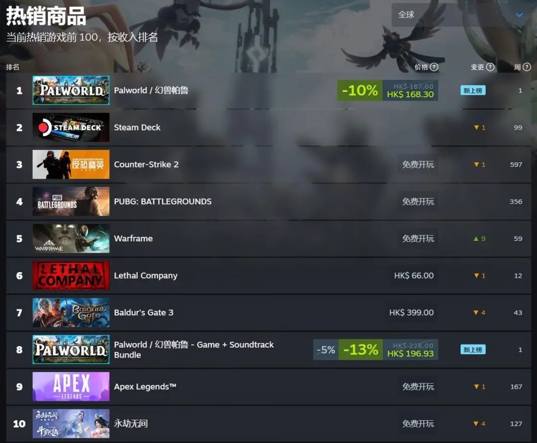 但超出所有人预期的是:「Palworld」上线后只用了短短数日就将 Steam 市场搅得天翻地覆,并以力压群雄的姿态空降全球畅销榜冠军,成为 PC 端开年的第一匹黑马。