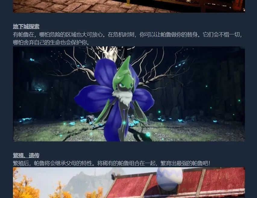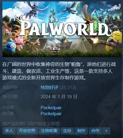 在「Palworld」的 Steam 商店页面,开发方罗列了游戏内缝合的所有元素,包括生存、探索(开放世界)、建造、模拟经营、工业自动化、地下城(副本)、宠物收集和繁殖、多人联机。