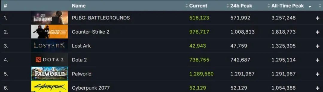 排在「Palworld」前面的只剩吃鸡、CS2、失落方舟、Dota2 这四款有巨头背书的大 DAU 多人产品。