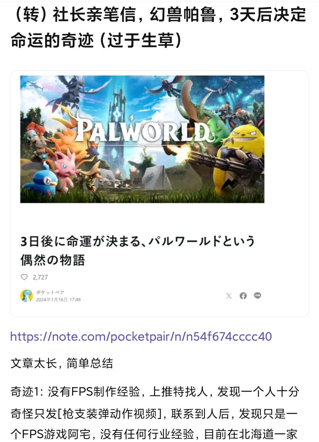 在 1 月 16 日,也就是游戏上线 3 天前,Pocketpair 社长发表了一篇名为《3 天后决定命运的奇迹》的亲笔信。这篇信的内容在游戏上线后,于从业者和玩家群体中广泛传播。