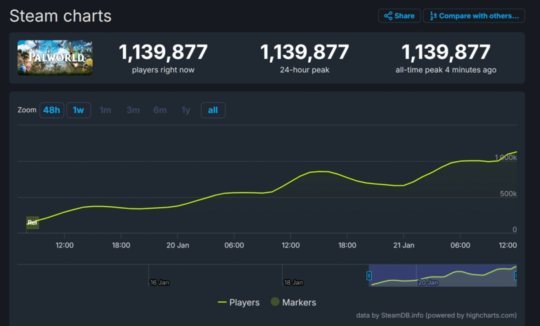 由于「Palworld」爆发过快,大量第三方统计网站的数据还未同步更新。但根据 Pocketpair 官推信息和过往产品经验,在不计微软 XGP 买断费的情况下,「Palworld」Steam 端首周营收突破 1 亿美元已经是板上钉钉的事了。