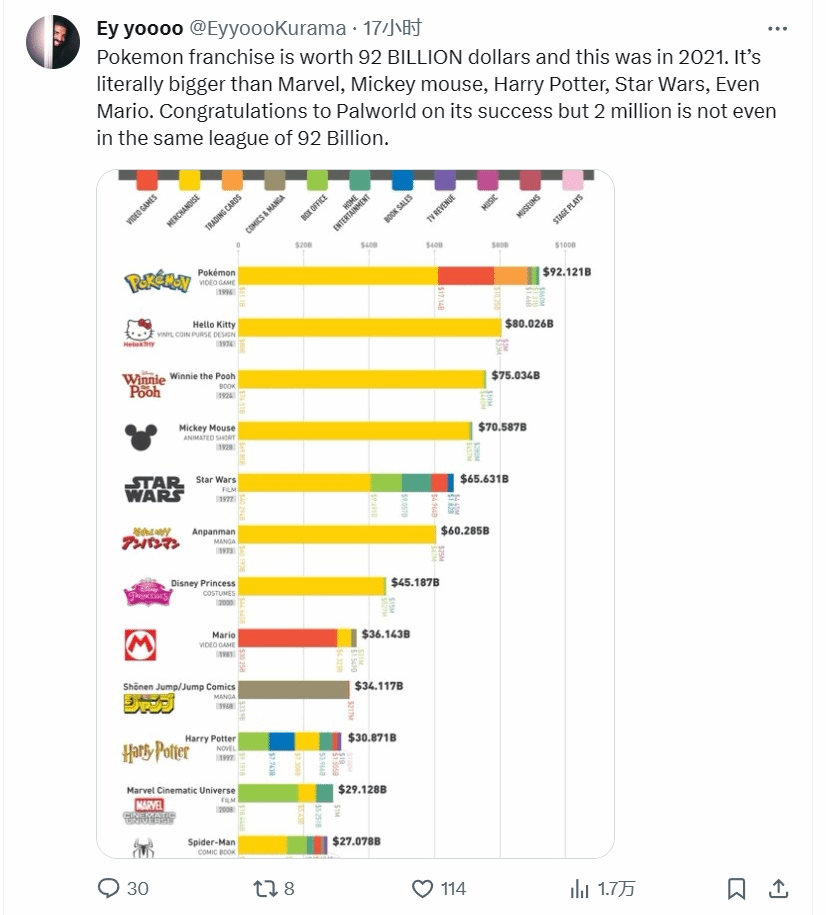 更重要的是,由于研发过程太过随意仓促,导致「Palworld」以一种合规层面近乎鲁莽的方式,贸然切入了任天堂生态最柔软的腹地——价值超过 920 亿美元的宝可梦 IP。