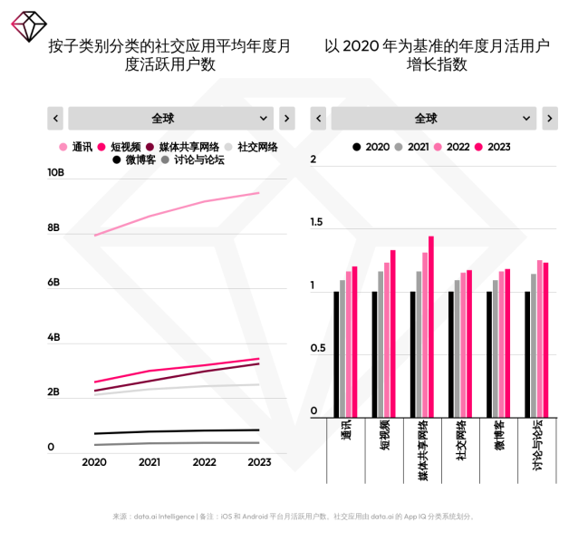 尽管 2023 年社交应用全球下载量同比下降了近 4%,这主要是由于以 X 为代表的微博客应用的衰退,而其它多个类别社交应用仍表现出增长潜力。