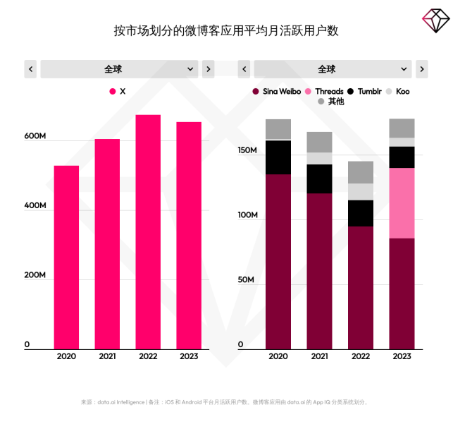 在全球范围内,X 使用量的下降被 Threads 等竞争对手的增长所替代。但是,在美国,X 的竞品尚未弥补 X 用户群的下降,2023 年微博客的总体使用量略有下降。
