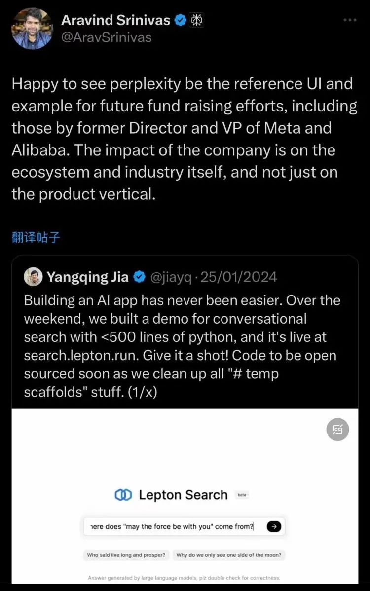 其创始人 Aravind Srinivas 在推特上很快转发贾扬清的推特并表示:“太棒了,看到 Perplexity 成为一些融资动作的参照物,包括前 Meta 和阿里巴巴高管都这样做。这说明 Perplexity 的影响力不局限于产品本身,而是辐射到了整个科技生态和行业发展,令人振奋!”