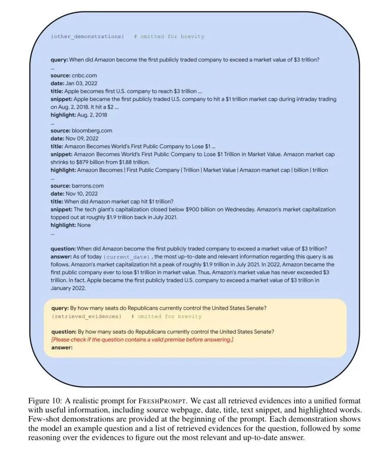 在这篇《FreshLLMs: Refreshing Large Language Models with Search Engine Augmentation》的论文里,他们提出了一种 FreshPrompt 的技术思路,也就是为了解决预训练模型对正在发生的事情的无知,要把它与实时搜索能力结合,而结合的方法是通过提供一种 Prompt,这种 Prompt 本身是在按照发布日期,关键信源等各种要素来为大模型提供上下文信息,并通过一组优化的 Prompt 来引导和改善大模型生成更实时更好的回答。