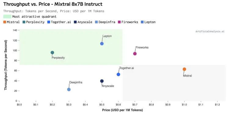 在这条 Lepton Search 的发布推特引发讨论的同一天,AI 创业公司 Martian 的一份开源大模型 API 推理榜单发布,对多款推理产品在主要的开源模型上的推理成本、速率和吞吐量等指标做了测试,而 Lepton 拿下多项关键指标第一。在另一个由 ArtificialAnalysis.ai 发布的 API 推理榜单中,Lepton 也拿下了 Mixtral 8x7B 这个模型的每秒处理 Token 数的第一,并且是唯一一个支持 Mixtral 32k 上下文窗口的服务。“它的价格也极具竞争力”,这个榜单这样说。