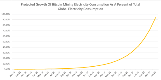 2017年11月,Digiconomist发布一组数据显示,当前全球用于比特币“挖矿”所产生的年用电量预计为29.05TWh,即290.5亿度,占全球总电力消耗的0.13%,以国家为单位,排全球第61位。问题是增速惊人(月增速接近30%),到2020年2月,预计占比达到100%,将耗尽全球电量。